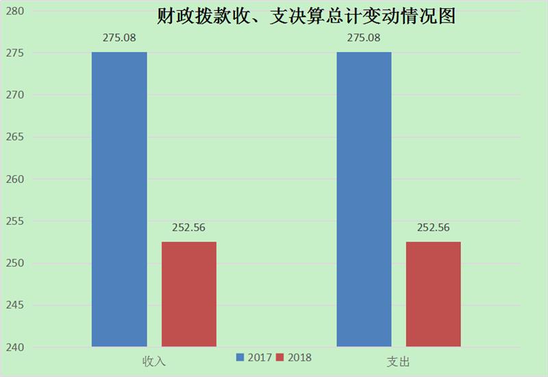 2018年财政拨款收入总计252.56万元、支出总计252.56万元。与2017年相比,财政拨款收入减少22.52万元,下降8.19%;财政拨款支出减少22.52万元,下降8.19%。主要变动原因是其他对个人和家庭的补助支出及职业年金财政拨款减少。